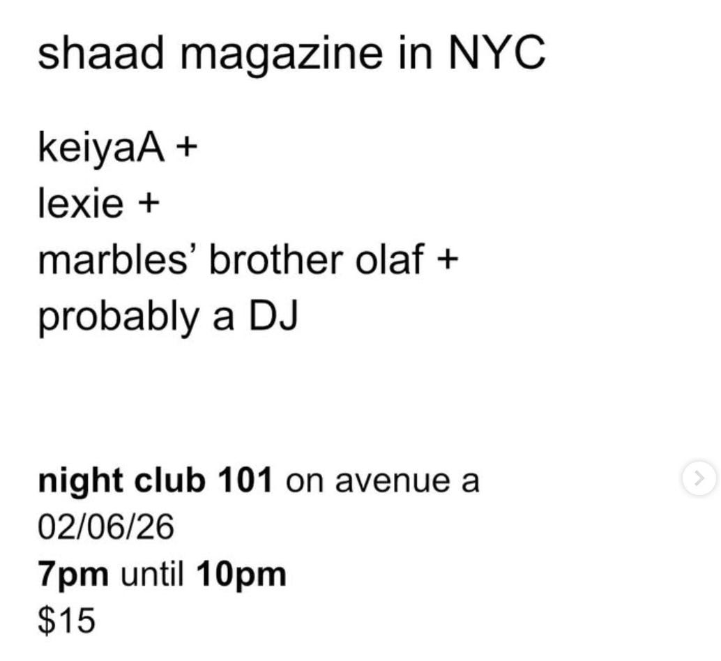 For Fans of: You should all be fans of Shaad magazine, I am such a big fan of it his zine, he really makes me smile and laugh. It’s different than any other music mag. The interview with Audrey Hobert is my fave. “Youngster” by Lexie and “take it” by KeiyaA
